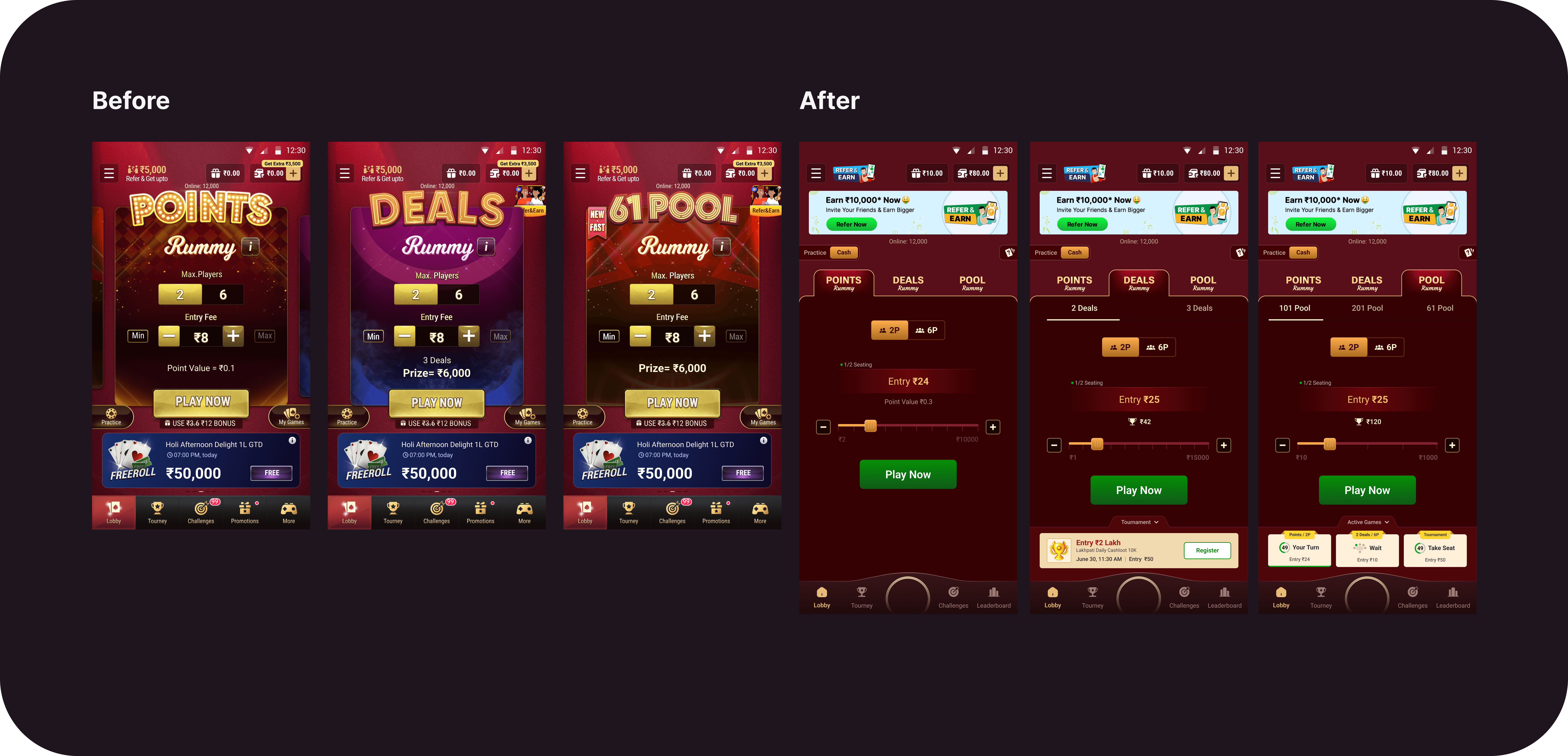 Users struggled to find their preferred game variant (Points, Deals, Pool) due to horizontal scrolling and scattered entry fees & prize levels. This made navigation slow and confusing.